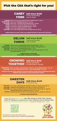 Caney Fork Farms, Delvin Farms, Sweeter Days Farm, or Growing Together. - Participants are able to receive a “half share” which is a weekly or bi-weekly pick up of produce with the farm of their choice.